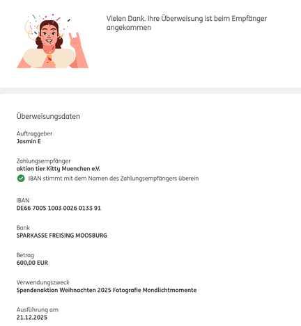 Heute konnten wir wieder 600 Euro an einen wundervollen Verein überweisen - ein Moment, der uns jedes Jahr aufs Neue dankbar macht.